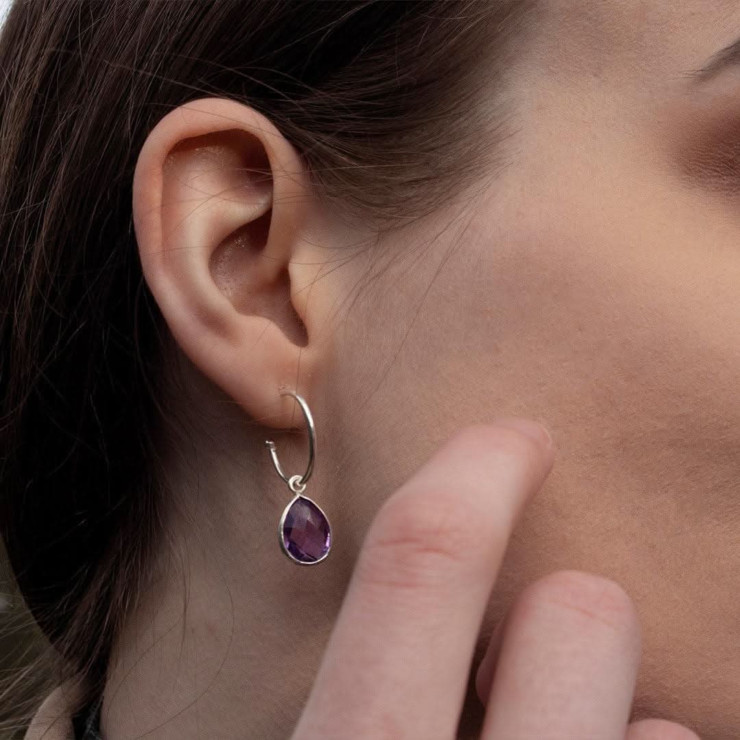 Add vibrancy to your collection with our Amethyst Drop Hoop Earrings, the birthstone for February. A real Amethyst gemstone has been cut into facets by our gemstone cutters to show the stone to its best advantage. The gemstones are detachable and interchangeable so you can add additional stones for a truly versatile look. Choose from the gemstone drop-down menu below. The hoops can also be worn on their own without stones or charms, making them a versatile and stylish addition to your jewel box.