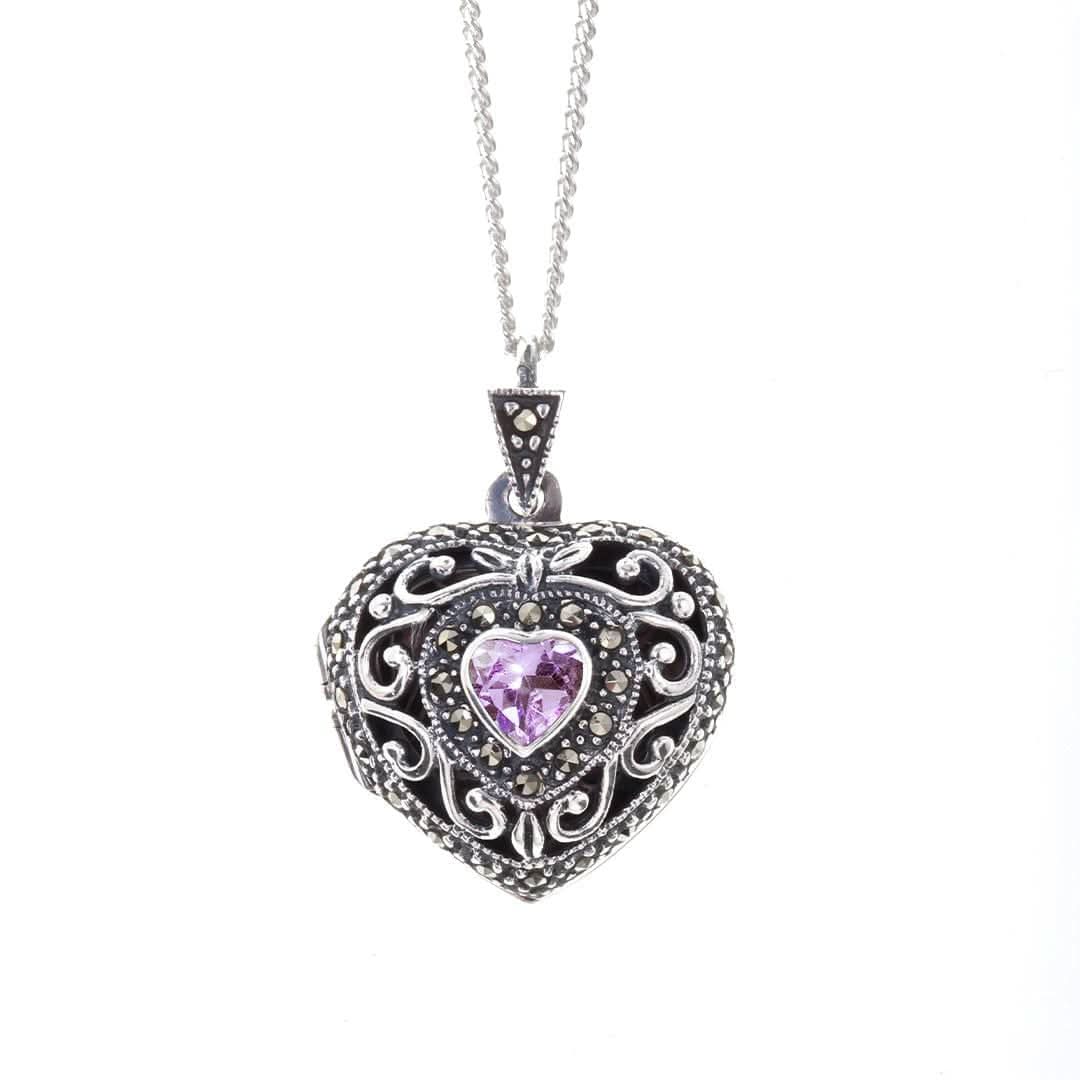 Capturing the essence of romance and sophistication, our Amethyst Vintage Heart Locket is hand-crafted in sterling silver, with meticulous attention to detail. The amethyst is surrounded by a collar of marcasite. The locket is hallmarked with a full UK hallmark by the Edinburgh Assay Office, giving you peace of mind. The locket opens to hold two photos or a tiny keepsake. This is our deepest cavity locket because of the 3D nature of the design. Â