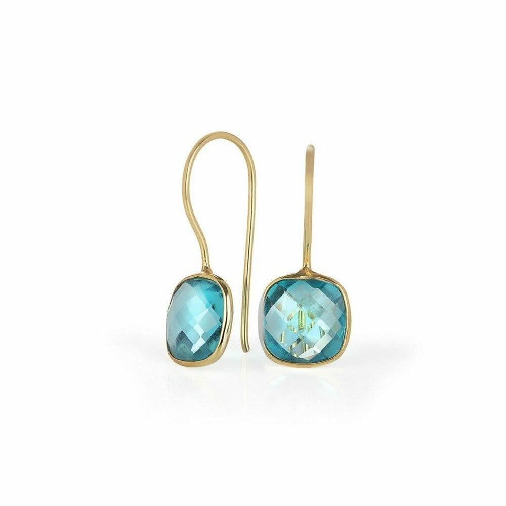 Luminous is a stunning collection of single gemstone cocktail rings and earrings in three precious metals. These blue topaz gemstone earrings in a gold vermeil setting have fabulous clarity, depth of colour and luminosity. The multi-faceted cut catches the light and shows the stone to its best advantage. Stone measures 10mm x 10mm. Earring length 25mm. Matching ring available.