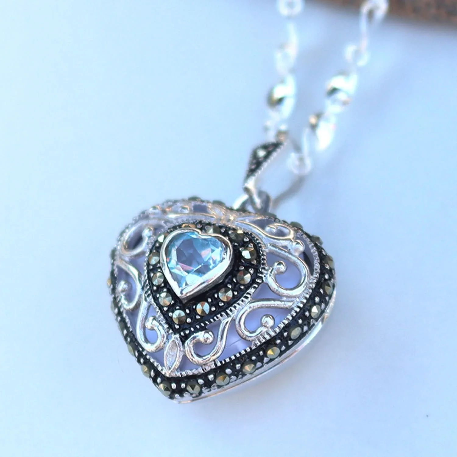 This locket features a beautiful, heart-shaped, faceted-cut, Swiss blue topaz gemstone at its centre surrounded by marcasite. Blue topaz symbolises sweetness and affection and is the stone for happiness. It is also known for its soothing and calming qualities and is the birthstone for December.