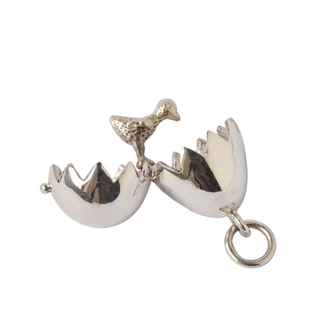 A Sterling Silver egg pendant which opens to reveal a little chick. This pretty oval locket is hallmarked in Edinburgh. The Charming Chick locket is guaranteed to make you smile. Wear it closed and it is a sleek and sophisticated egg pendant. Wear it open for a quirky, fun vibe. The egg locket is made of solid sterling silver and opens to reveal a little silver chick. The locket is hallmarked by the Edinburgh Assay Office with a full UK hallmark and comes in a black ribbon-tied box with a polish cloth and storage pouch to keep it in perfect condition. The locket measures 30mm x 20mm and comes with a sterling silver curb which is available in a selection of lengths.