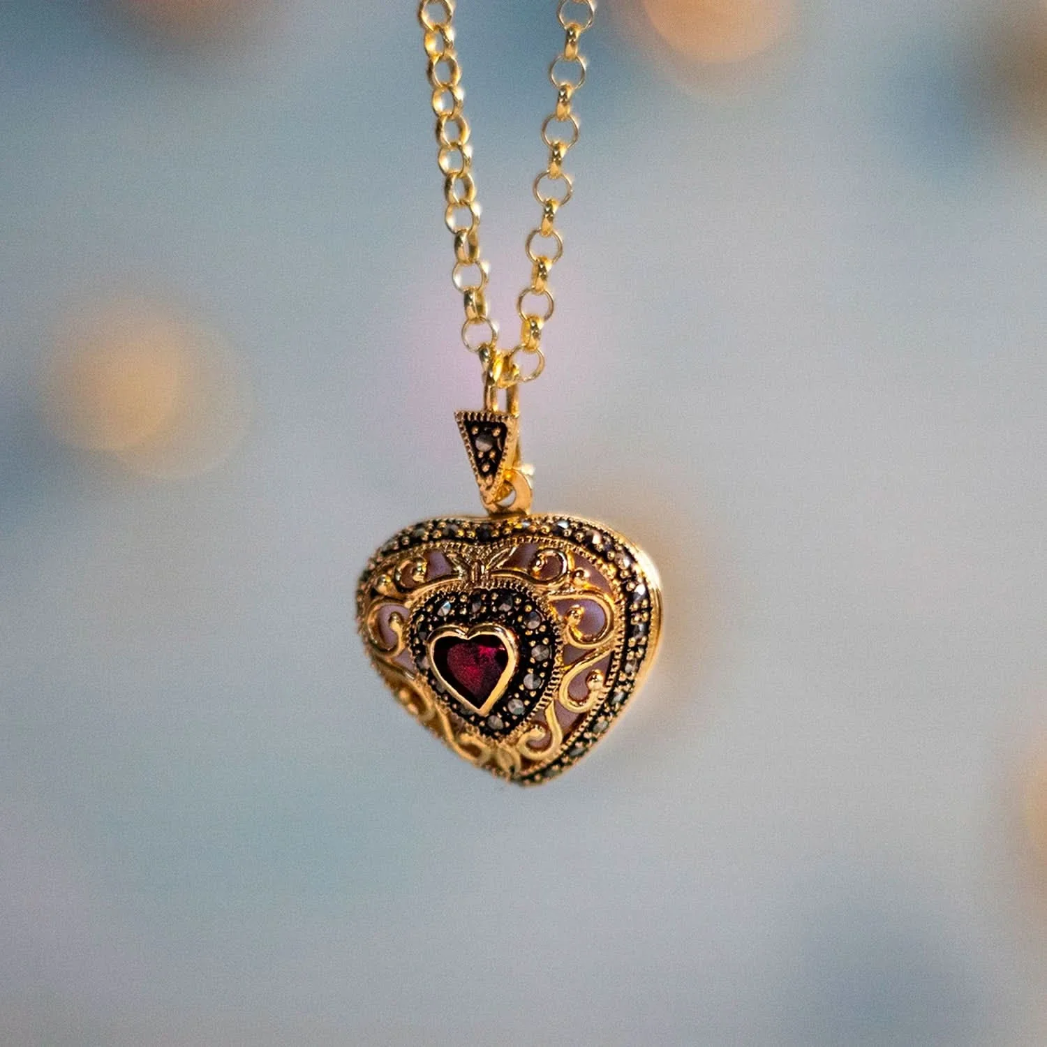 Our most romantic locket, our Garnet Vintage Heart Locket is hand-crafted in 18-carat gold vermeil, with meticulous attention to detail. This locket is hallmarked with a full UK hallmark by the Edinburgh Assay office, giving you peace of mind. The locket opens to hold two. This is our deepest cavity locket and is perfect for holding a tiny keepsake or lock of hair. Â