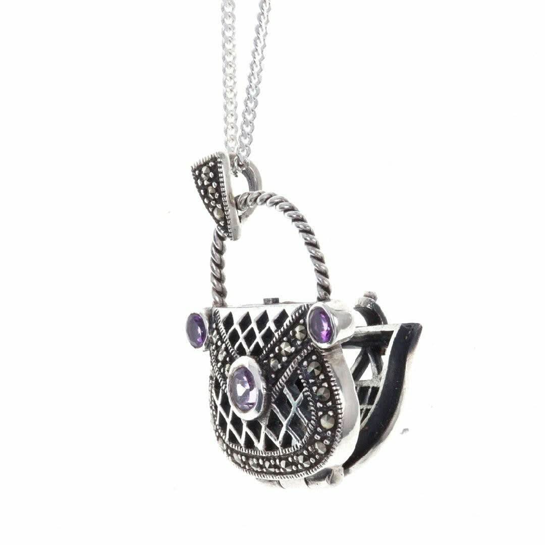 This charming purse locket is designed to delight and surprise you. Beautifully crafted in sterling silver, the locket is studded with three sparkling amethysts set in a lattice-work and adorned with marcasite. The amethyst handbag locket opens to take a secret message or a tiny keepsake and is a charming locket to give or receive.