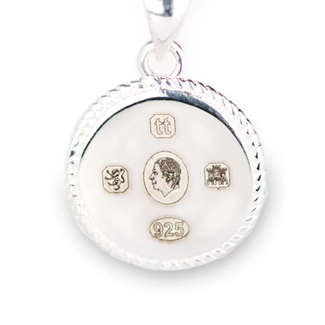 The Commemorative Hallmark features the King's head as the central image surrounded by the traditional finesse mark, Lily Blanche's unique mark and the castle mark of the Edinburgh Assay Office which tests and hallmarks our jewellery.