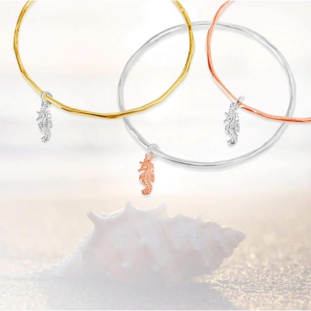 The perfect summer jewellery, our rose gold bangle, makes ideal holiday jewellery. Wear with the matching seahorse locket, pendant and earrings for a carefree, breezy look.