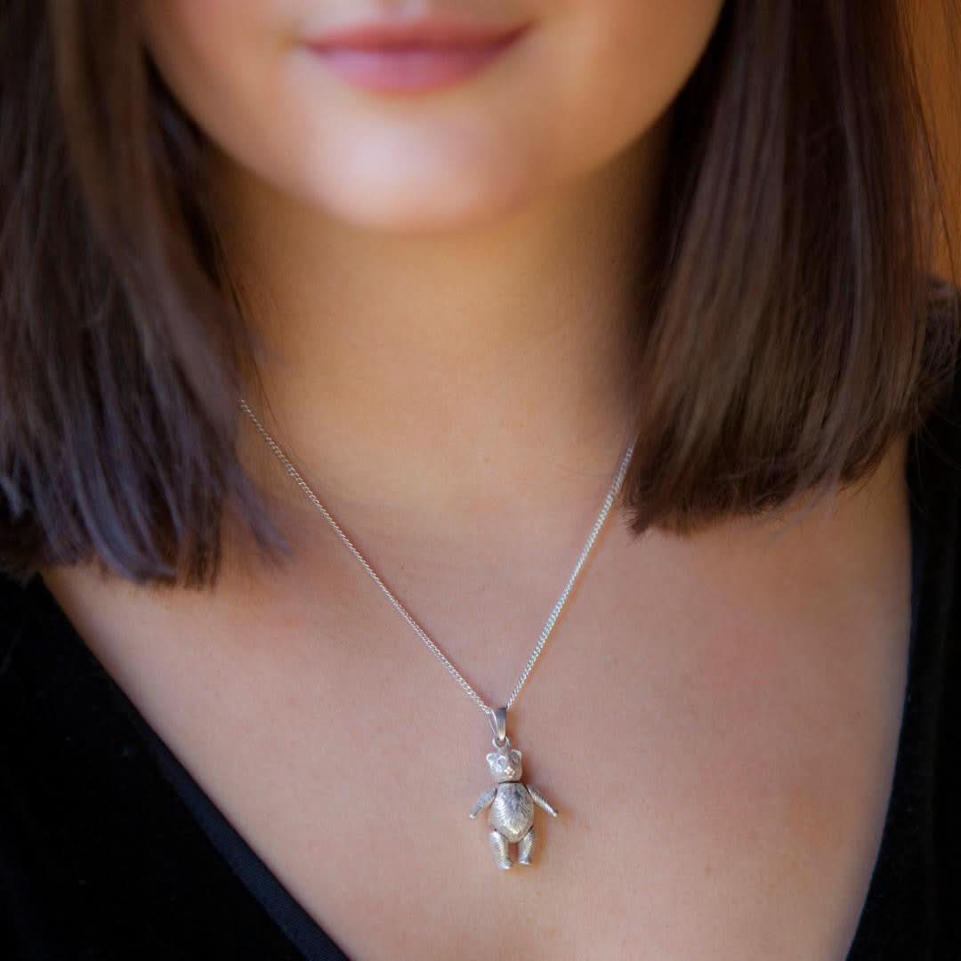 A firm favourite with the young ay heart, our large Sterling Silver Teddy Bear necklace is fully jointed giving him oodles of character. His arms, legs and head all move making him come to life.
