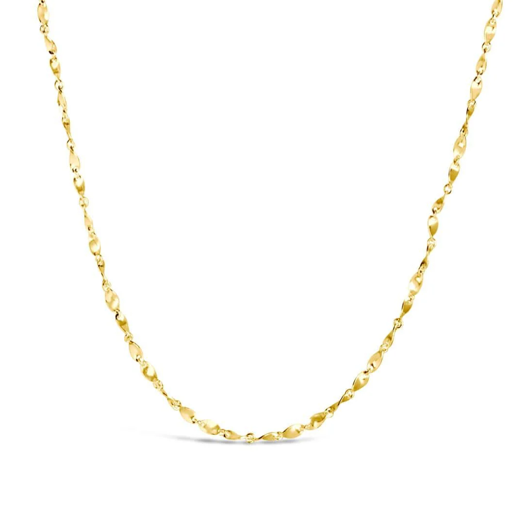 Handmade to our specifications, our twist chain features a highly polished, bevelled link measuring 8mm x 3mm. The links are attached to each other with a small, circular ring giving the necklace fluidity and adding extra interest and strength. The twist chain is suitable for medium weight and heavy weight pendants and lockets. Finished with a lobster style catch, the twist chain is highly versatile. Also available in sterling silver, rose gold and white gold vermeil.